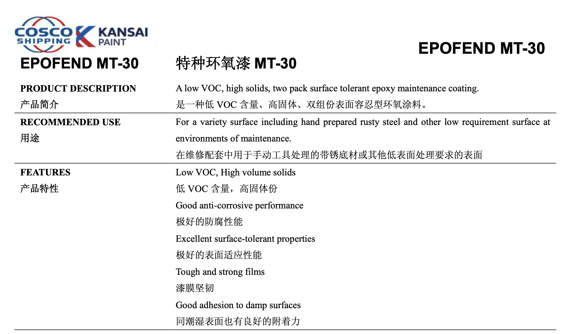 低 VOC 含量,高固体份 极好的防腐性能 极好的表面适应性能 漆膜坚韧 同潮湿表面也有良好的附着力