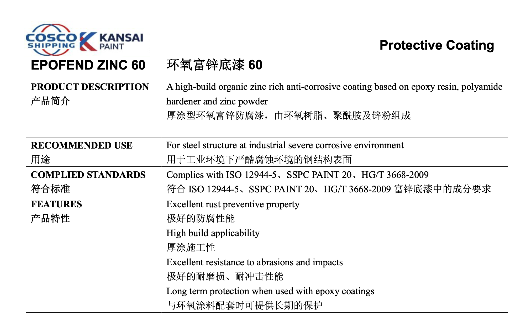 极好的防腐性能 厚涂施工性 极好的耐磨损、耐冲击性能 与环氧涂料配套时可提供长期的保护