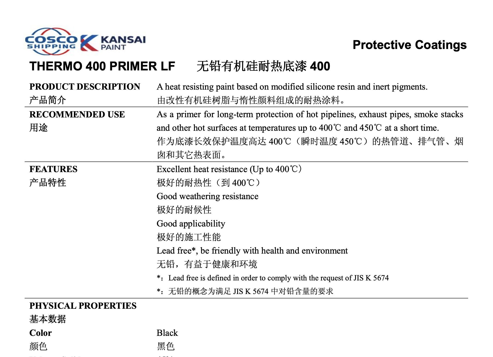 极好的耐热性(到 400℃) 极好的耐候性 极好的施工性能 无铅,有益于健康和环境